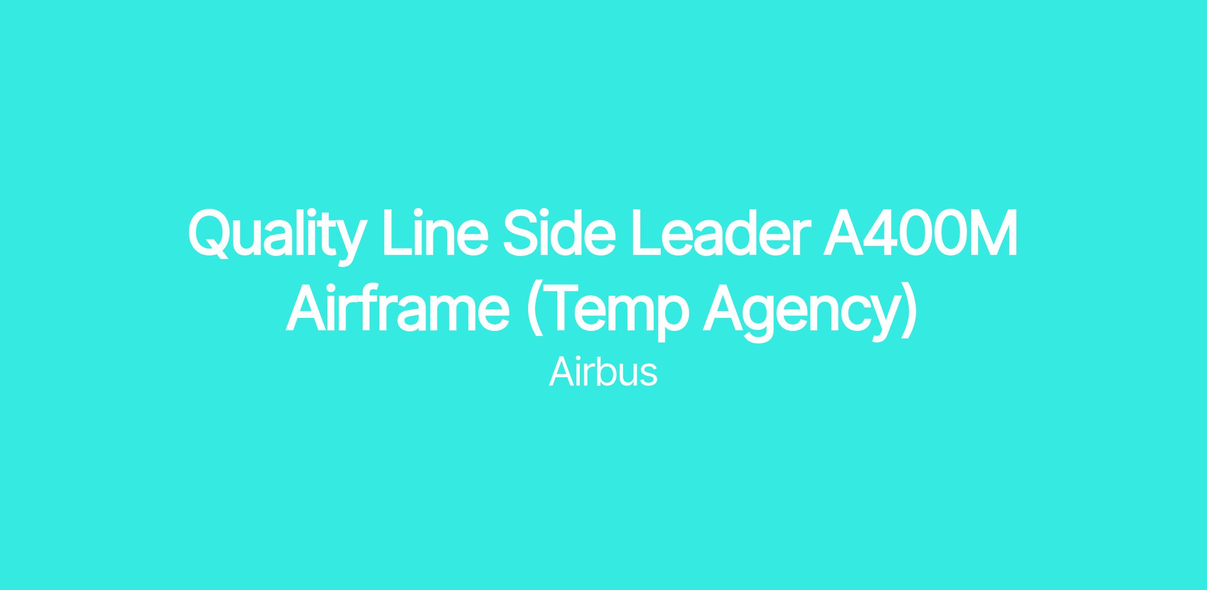 A temporary opportunity for a Quality Line Side Leader has arisen within A400M Airframe. The QLSL is responsible for ensuring the quality of manufacturing and assembly processes for the A400M airframe on the production line, driving continuous improvement, and leading a team of quality professionals.